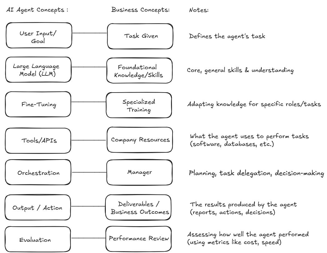 While tackling white papers and coding, I looked for a better way to grasp how AI agents work. I found the best method was relating them to concepts I handle daily, like business operations. Thinking about agents through that business lens made things click.